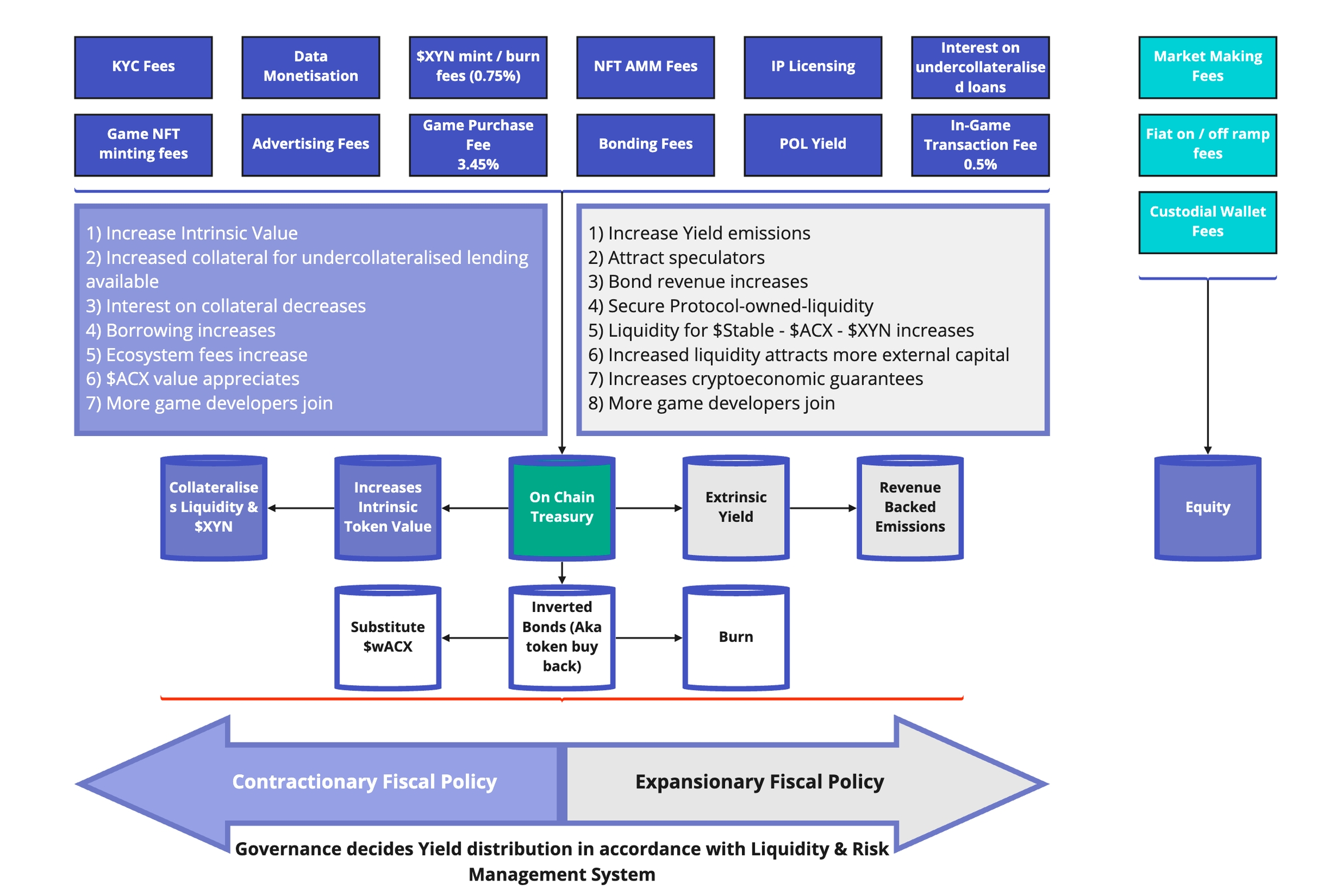 $XYN - is the tokenized representation of the Acxyn ecosystem treasury. It serves as the reserve currency that facilitates all liquidity operations within the protocol. The treasury sustains itself through a value-added-tax (VAT) model, taking a % royalty on the sales & licensing of assets within the ecosystem. The $XYN token can also be considered a liquidity and in-game assets Index This will be a very large encompassing basket of assets and locked liquidity from the platform.